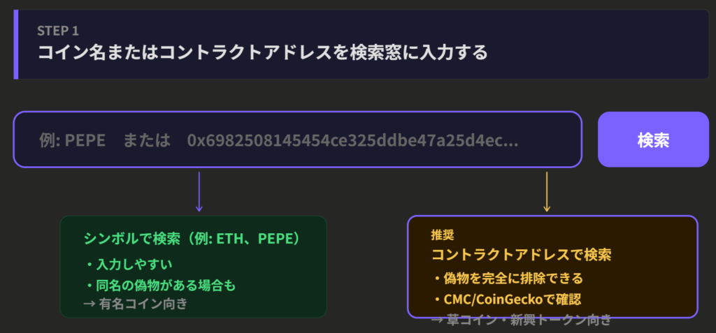 ステップ① コイン名またはコントラクトアドレスを入力する