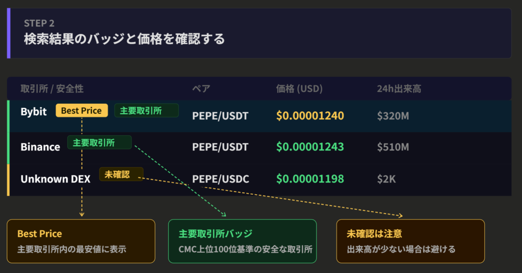 検索結果には各取引所の価格と安全性バッジが表示されます。バッジの意味を正しく理解することが重要です。