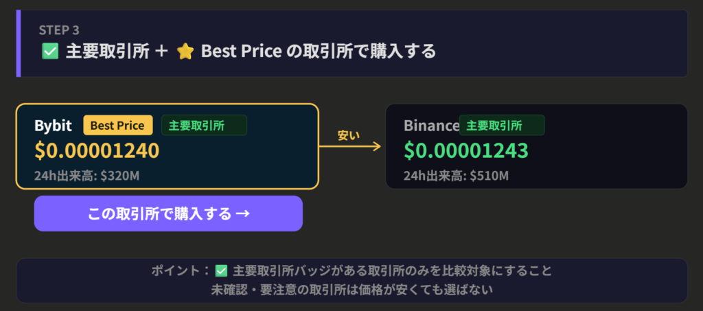 ステップ③ ✅ 主要取引所 + ⭐ Best Price の取引所で購入する