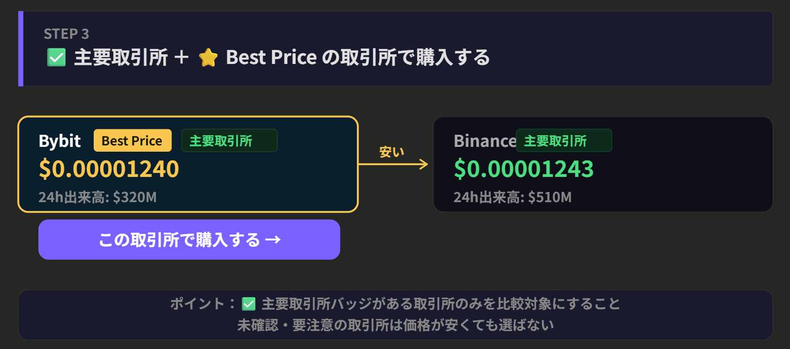 ステップ③ ✅ 主要取引所 + ⭐ Best Price の取引所で購入する