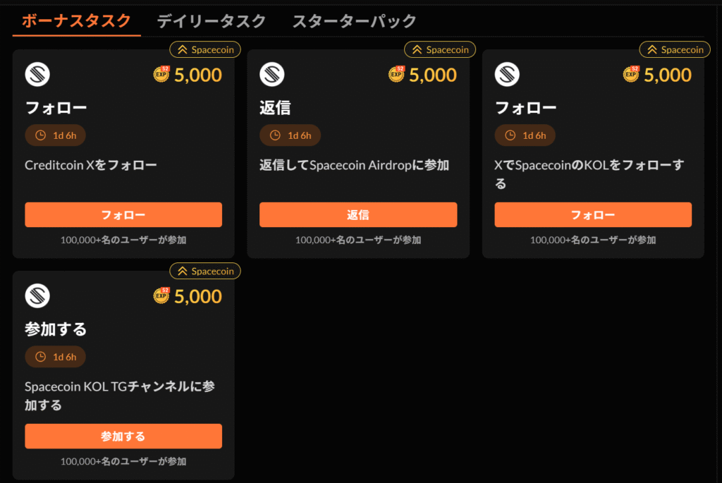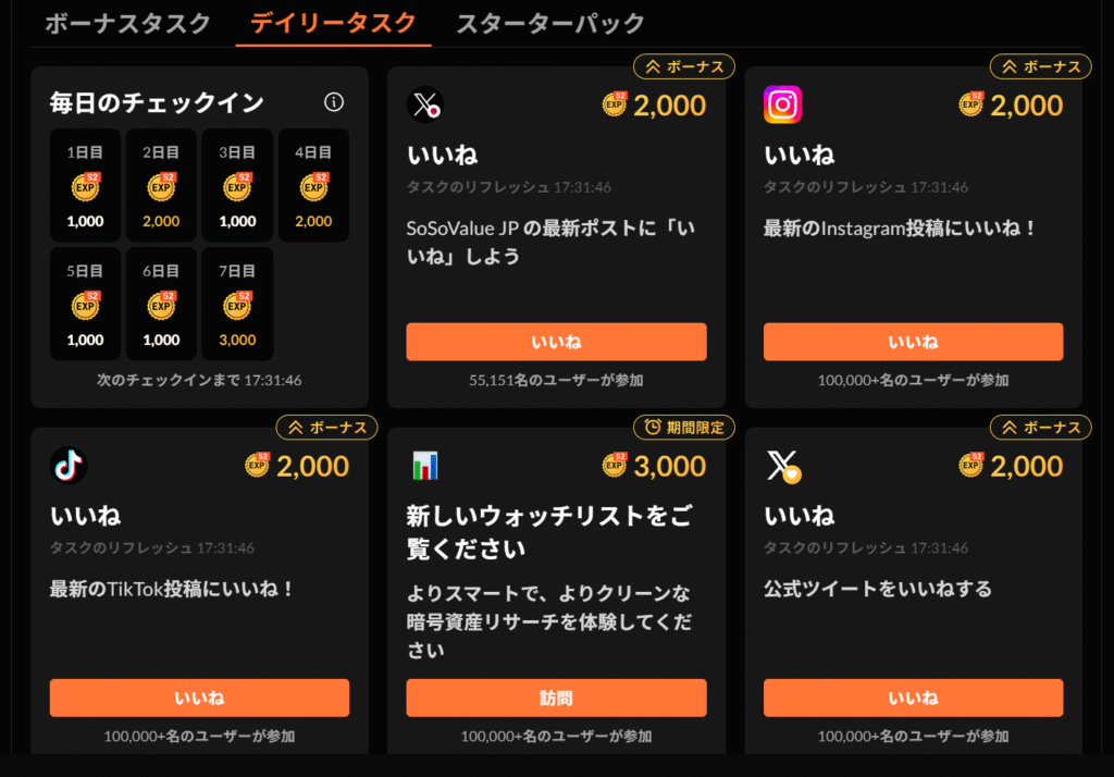 - 毎日ログイン:チェックインでEXP自動加算。タスクは動画視聴やRTなど、1日5分以内で終わる。