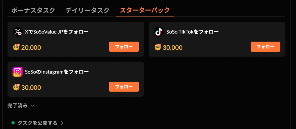 - アプリダウンロード(オプション):Google Play/App Storeで「SoSoValue」検索。アプリ版で追加EXP。