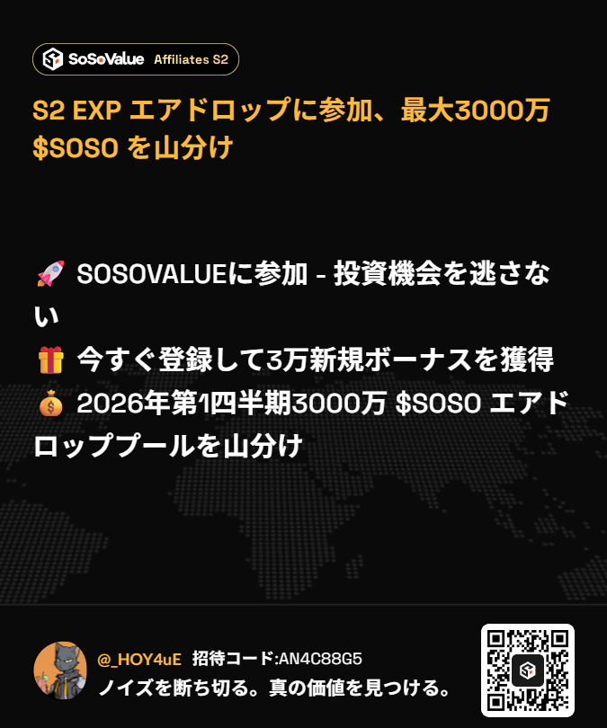 Web3の世界で話題沸騰中のAI駆動型クリプト投資プラットフォーム、SoSoValue($SOSO)。Season 1のエアドロップで多くのユーザーが数千ドルを無料でゲットしたあの熱狂が、再び帰ってきました! Season 2がスタートし、総額30M $SOSO(約30億円相当)の報酬プールがQ1 2026に配布予定です。しかも、一切のデポジット不要。毎日数分チェックインするだけでEXP(経験値)を積み重ね、報酬を増やせる仕組みは、初心者でも超稼ぎやすい。Season 1で平均$390〜$4,000、トップは$10,000超えを叩き出した実績から、Season 2はさらにスケールアップ。無料で参加できる今がチャンスです。かく言う私も、Season1の開始は出遅れましたが、毎日SNSのタスクをポチポチしてただけなのに、200$SOSOもらえました。(当時は$100だったので、3万円近い金額です。)