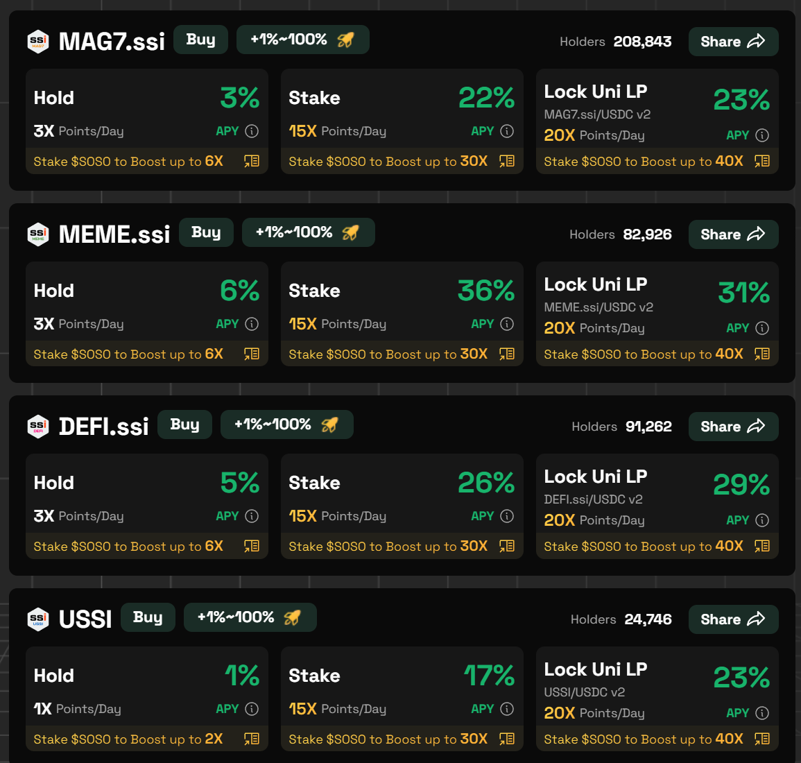 - ステーキングへの参加:SSIインデックスを購入、保有、ステーク、LP提供でポイント効率が倍増します。ステーク側はEpoch3をやっているので、こちらの両取りができます(オプションだが無料ユーザーも低額から可能)。
