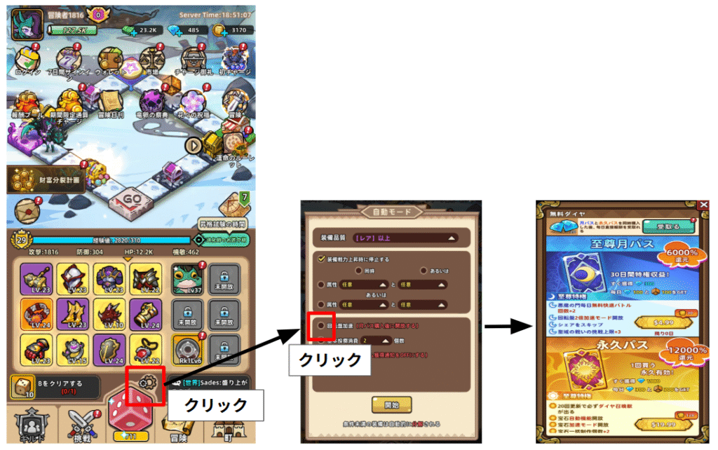 無課金でも遊べますが、月間パス(約2,000円) を購入するとさらに快適に進行可能。