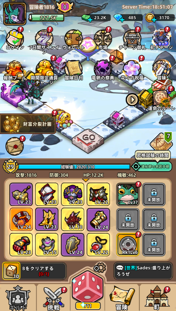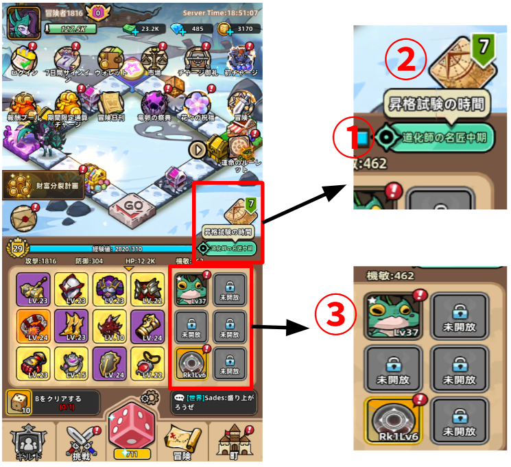 組み合わせによって戦闘力が倍近く変わることもあるため、ガチャや報酬で入手できるものは積極的に集めましょう。特定レベルに到達すると、解放されるので、積極的にレベル上げをしましょう。サイコロを振り続ければ、経験値がたまっていくので、スマホのスリープモードはオフにして、なるべく放置して、レベル上げするのが効率的。