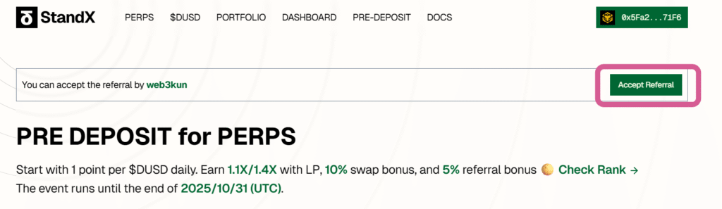 🔗StandX5%ブーストが効く招待リンク👉:https://standx.com/referral?code=web3kun