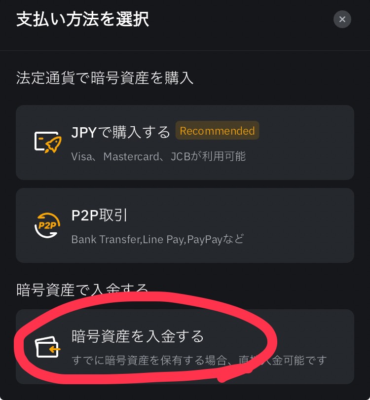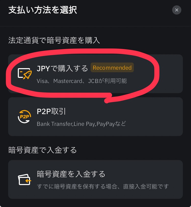 ※以下のスクショは、海外取引所でクレカ購入する場合に選択する箇所。