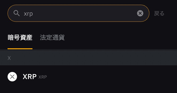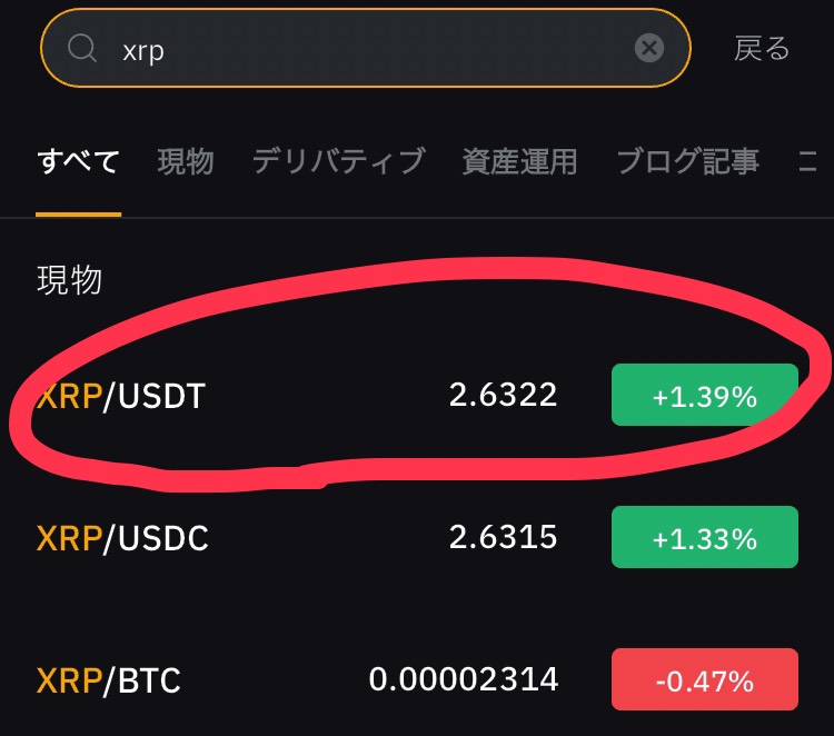 1. ホーム画面で、上の検索ボックスにXRPを入力して、XRP/USDTのペアを選択。