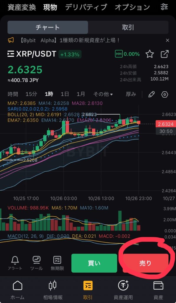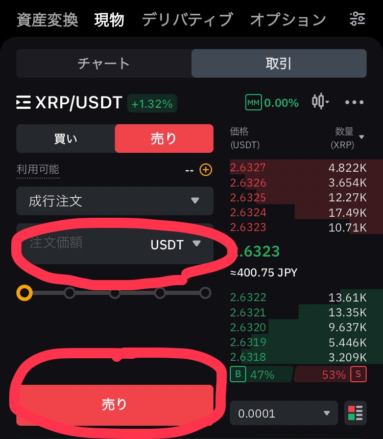 2.売りを選択 (この場合、XRP<=>USDTのペアで、XRPを売ることで、USDTを得るという意味合いになります。)