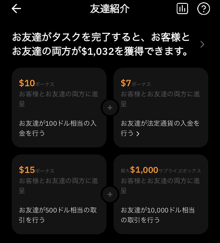 - 以下のリンクから入ると、新規登録者限定で最大1000USDT分の報酬が貰えます。