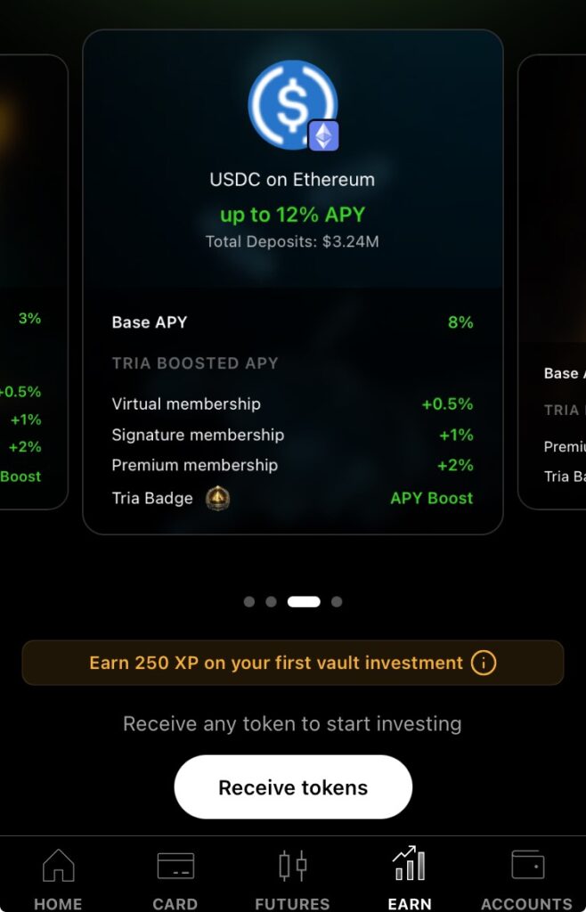 Tria has a system similar to a bank savings account. If you’re not using your money for payments, you can deposit it into the Earn feature (which works like a bank deposit), and earn up to an 8% annual interest rate.