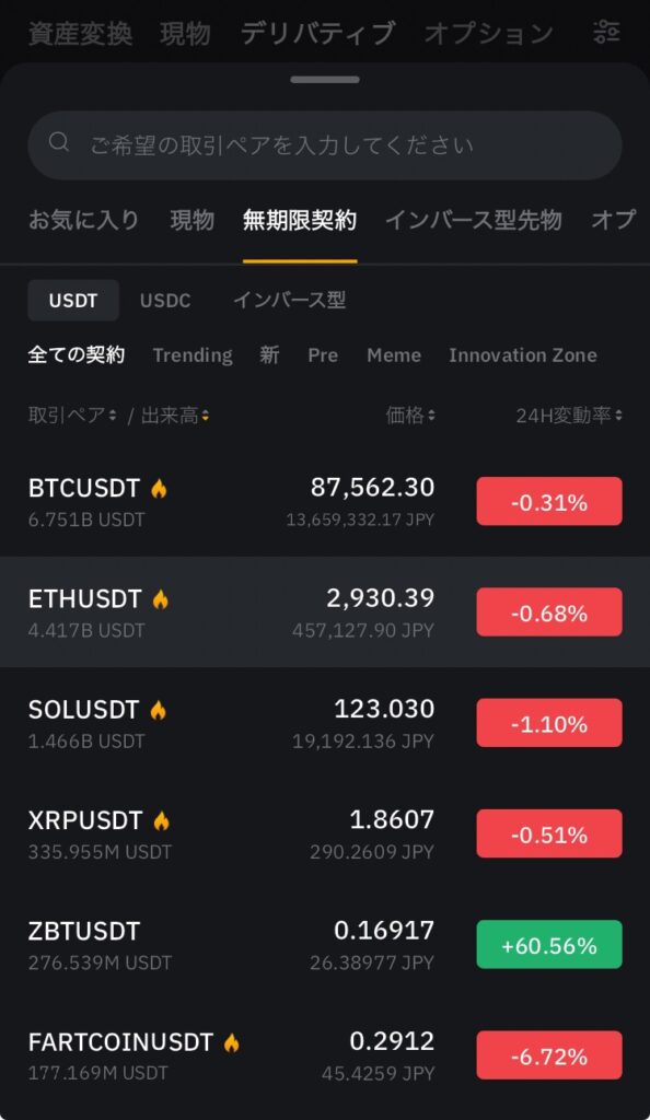 以下の画面で、通貨を選択できます。Bybitには通貨がたくさんありますよ。