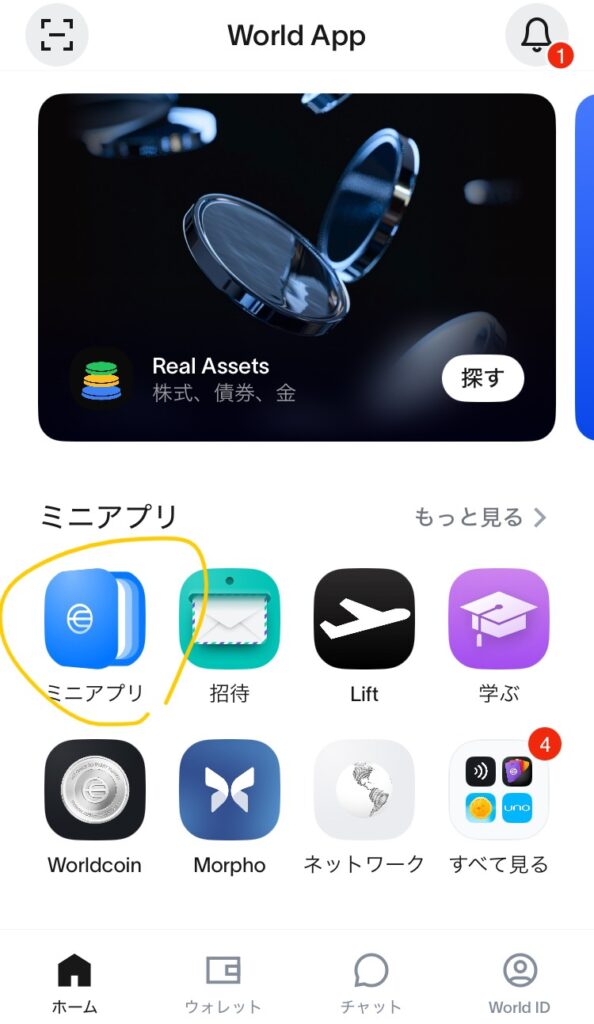 World App内のメニューから身にアプリを選択。